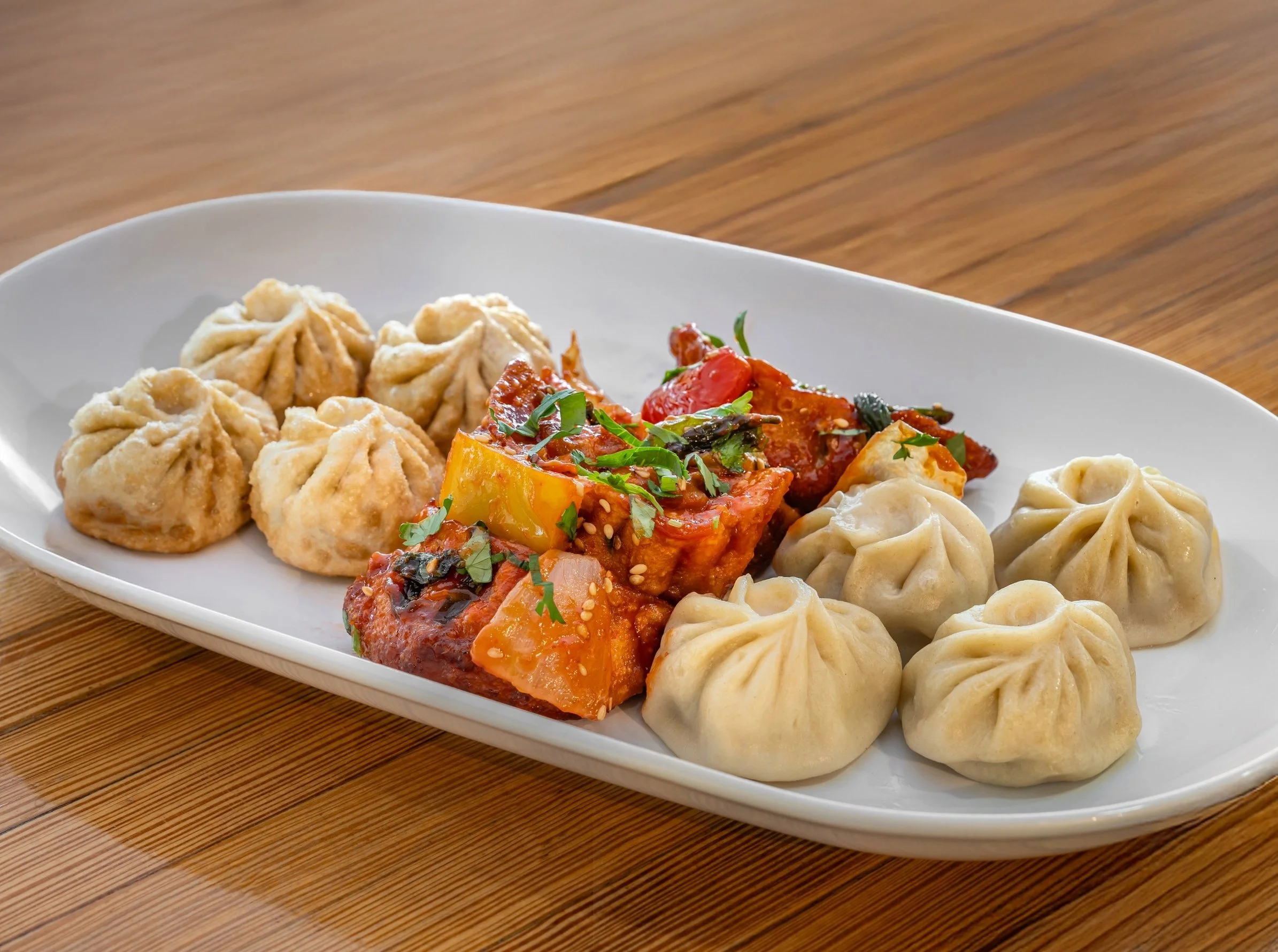 Steamed Momo, Chili Momo and Deep Fried Momo! Protein Options: Chicken, Pork, Beef and Veggie. Served with a side of homemade tomato chutney and spicy sauce. Handmade Nepalese Momo from scratch with fresh ingredients. -