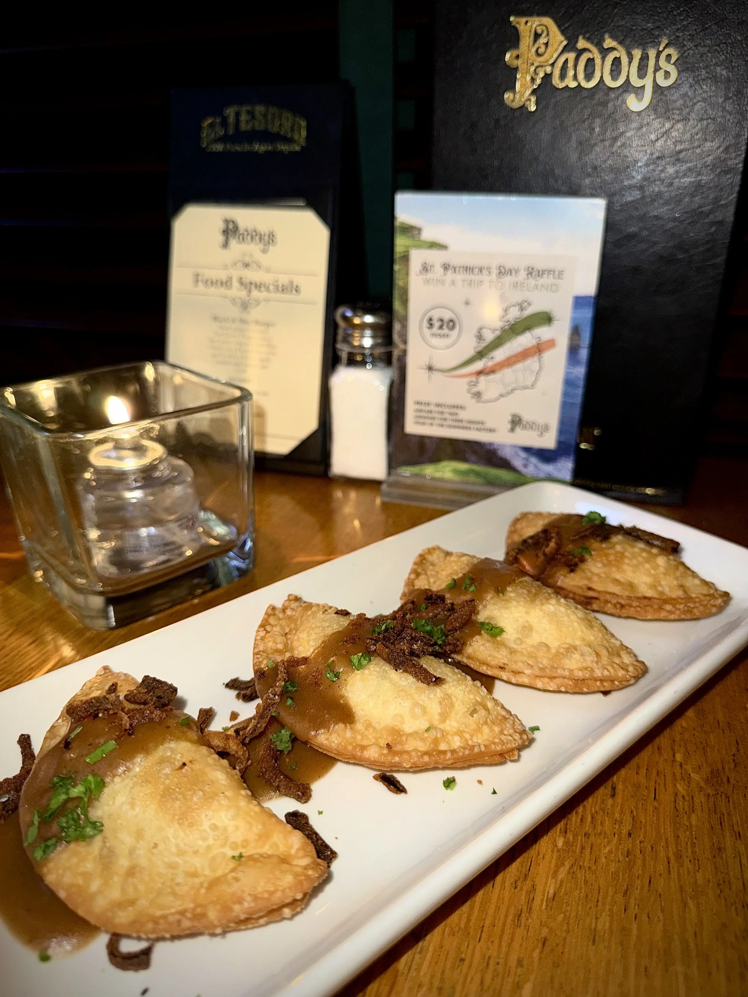 House made lamb banger sausage, mashed potatoes, and white cheddar cheese Stuffed into an empanada, deep fried and drizzled with our house onion gravy and topped with crispy fried onions -