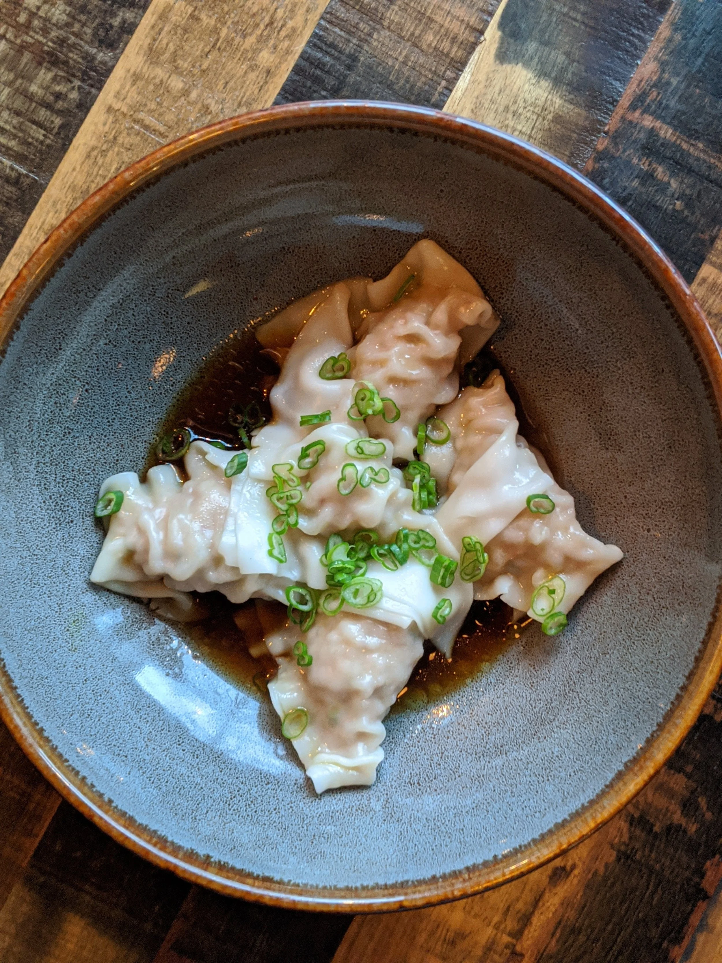 Ginger scallion pork, black vinegar, ponzu, crispy wonton. -