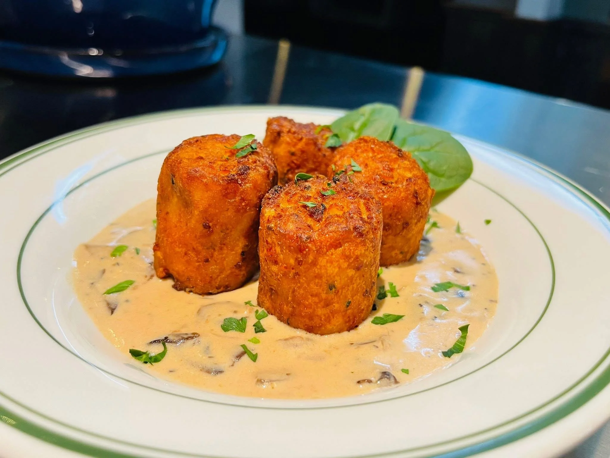 Crispy chicken potstickers smothered in our signature house-made creamy cheese sauce — comforting, rich, and a guest favorite. -