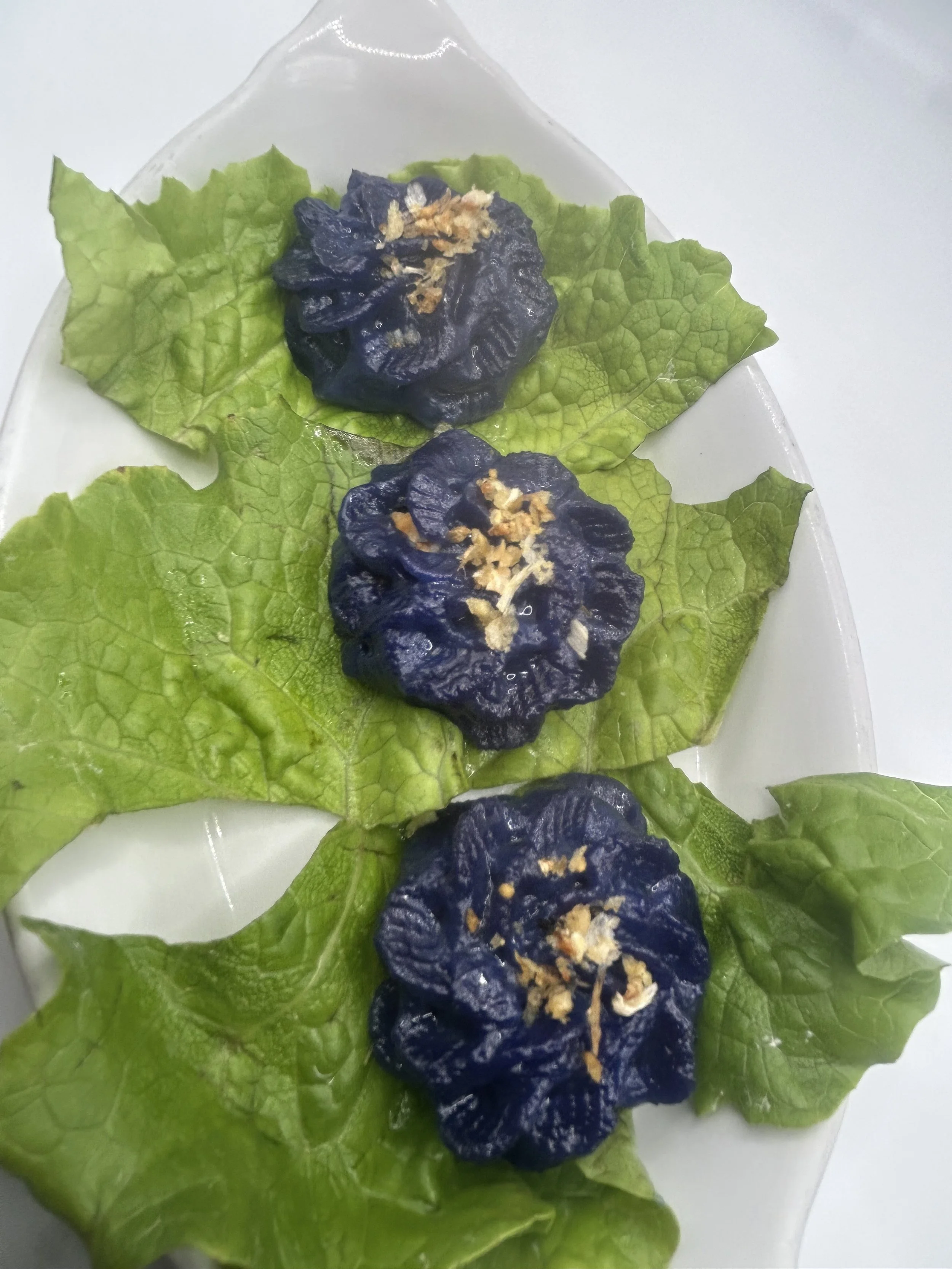 A gluten-free dumpling with chicken breast, carrot, panang curry paste, kaffir lime leaves, the dark blue color comes from butterfly pea flowers (a natural dye color) -
