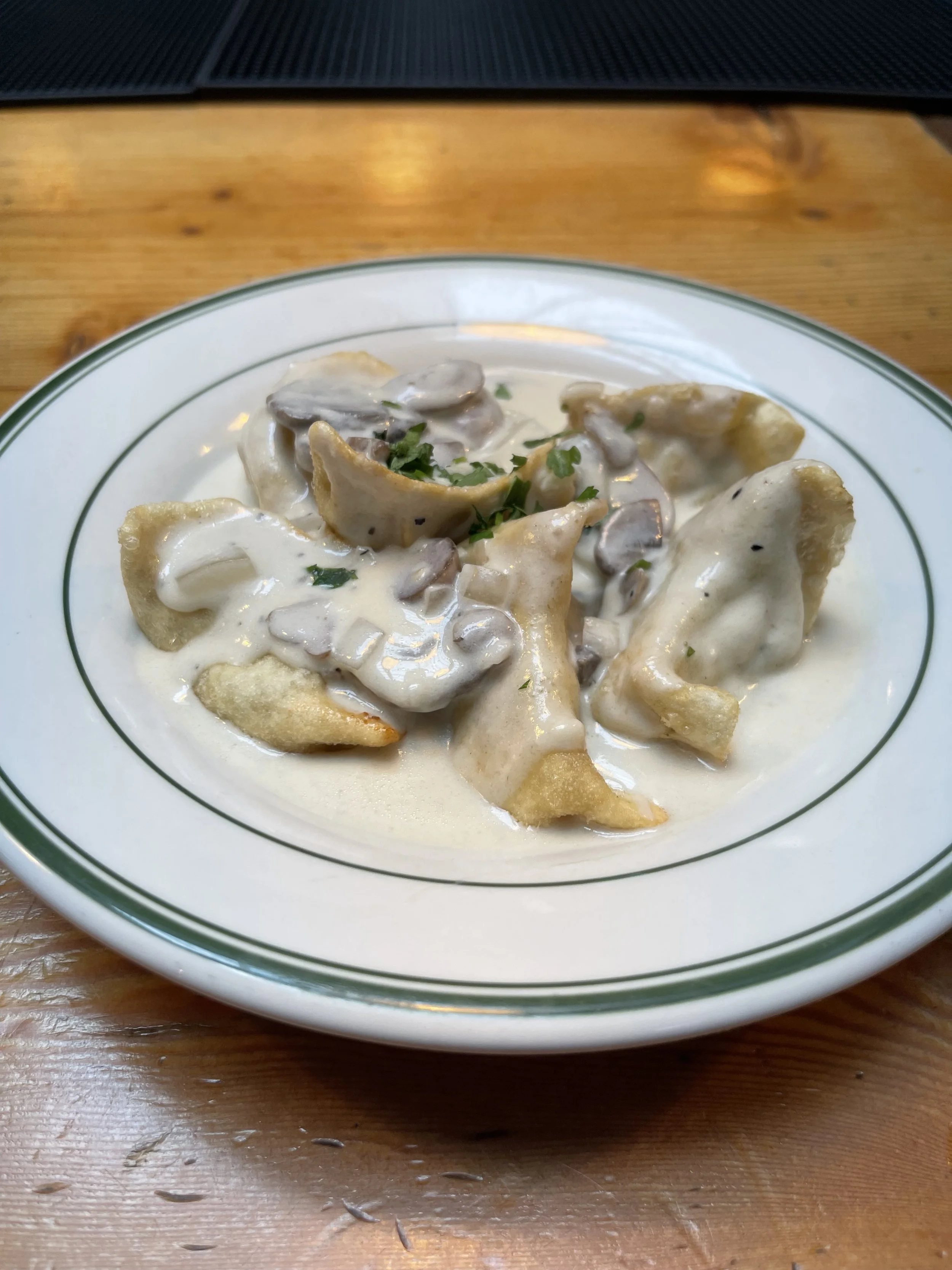 Filled with bacon and cheese, served with creamy mushroom white wine sauce.