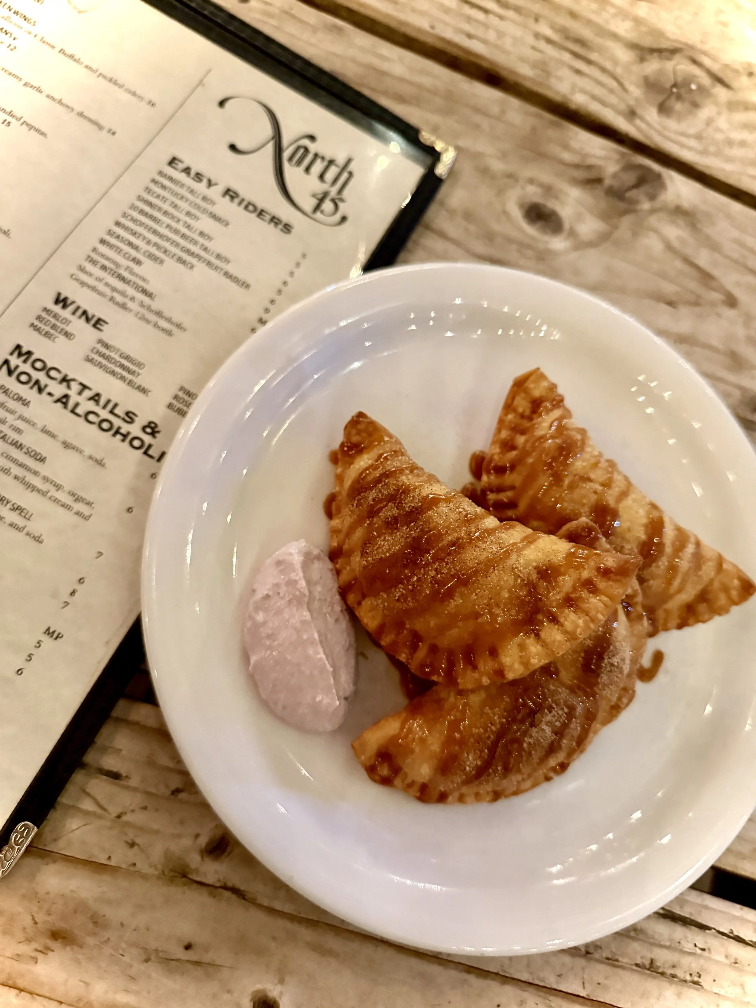 Peach pie empanadas served with blackberry ricotta whip and drizzled with a house made bourbon caramel sauce -